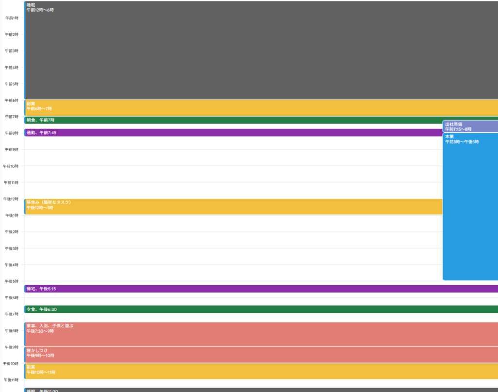 睡眠、通勤、食事、仕事、家事、育児、休憩、等々。